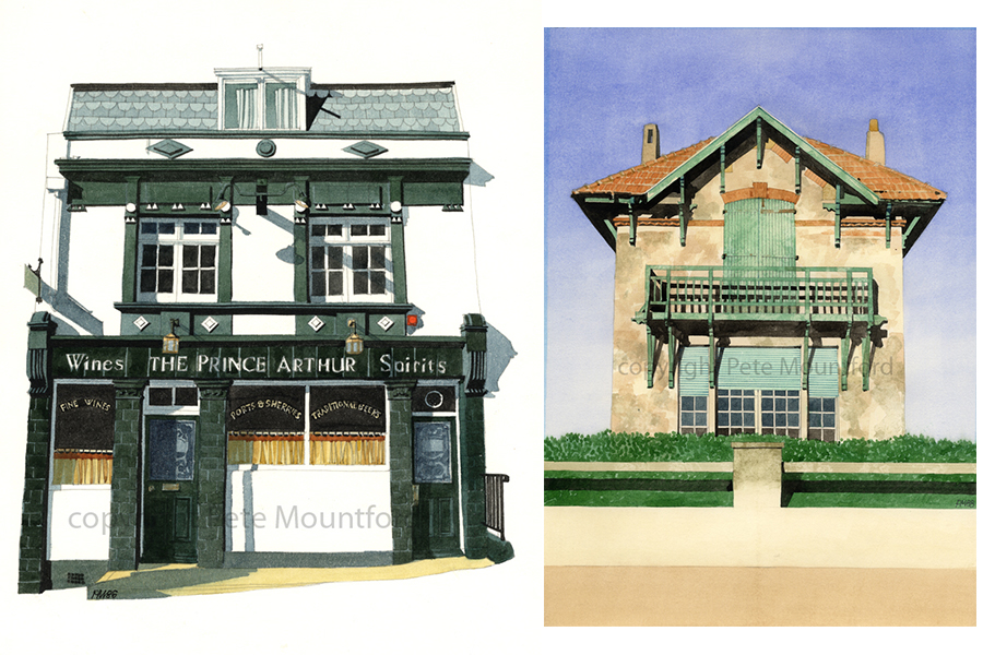Pete worked as a design architect, he paints buildings in watercolour that have interesting shadows, lines, age. Commissions taken, POA.